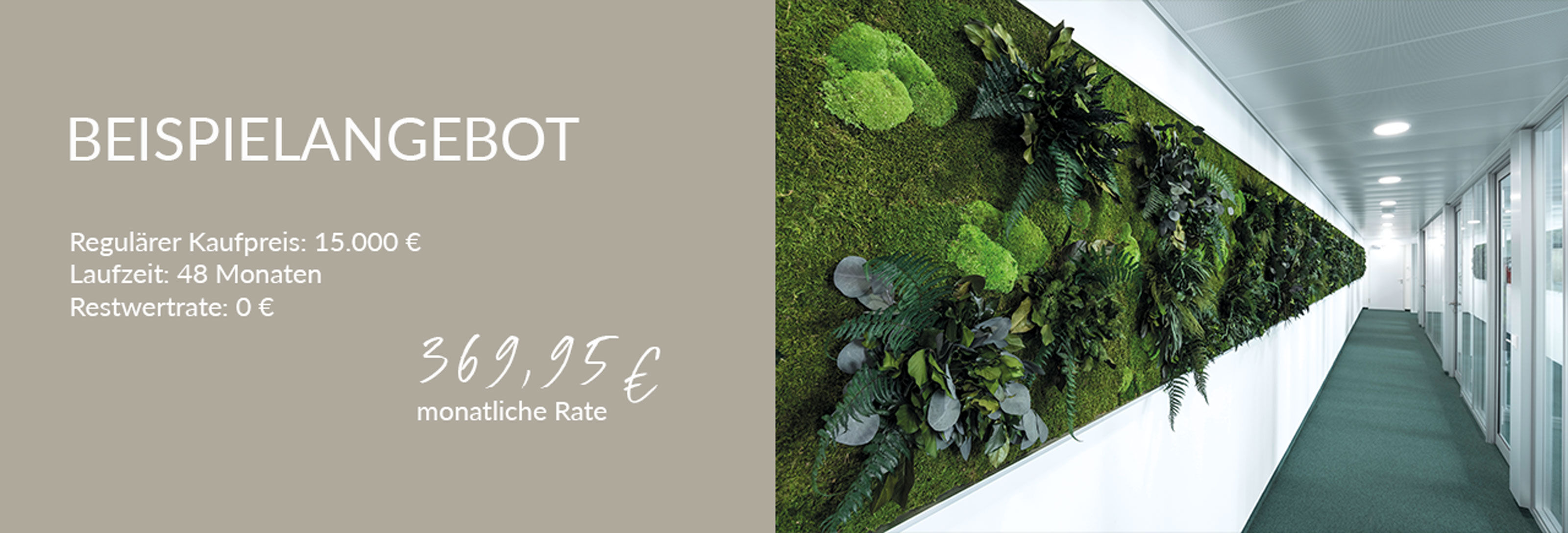 2. Keine Belastung Ihrer Bilanz: Die Leasingraten für die Mooswand tauchen nicht in Ihrer Bilanz auf. Dadurch bleiben Ihre finanzielle Kennzahlen unberührt, was Ihre Kreditwürdigkeit und Bonität positiv beeinflussen kann.