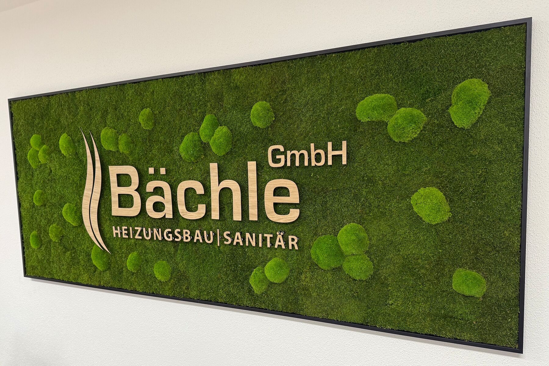 Logo aus Edelstahl auf Moosbild aus Kugelmoos