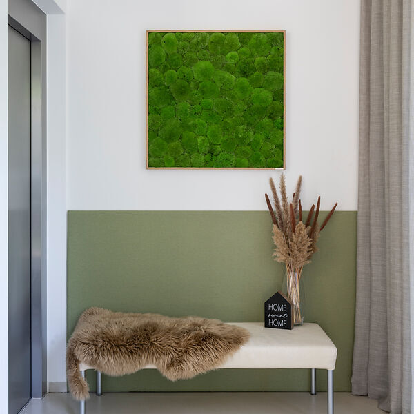 Unser 80 × 80 cm Kugelmoosbild umrahmt von einem Vollholzrahmen im Eichendesign bringt liebevoll platziert die Natur in alle Innenräume und verwandelt Ihr Büro, Restaurant, Hotel oder Zuhause in eine Oase des Wohlfühlens.