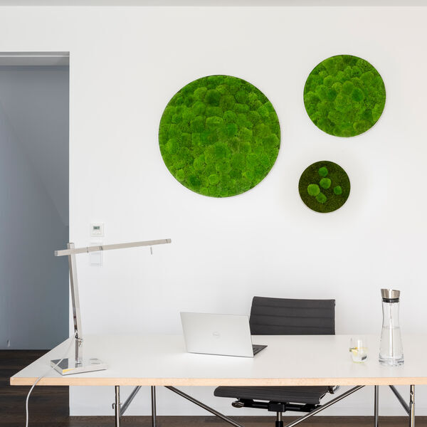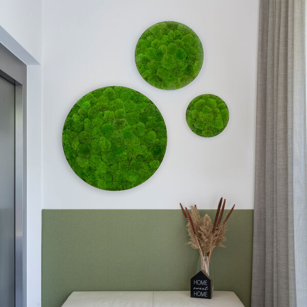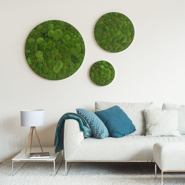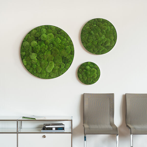 Die Mooskreise werden von hochwertigen Edelstahlumrahmungen eingefasst. Alle verwendeten Moose sind echt und zu 100% natürlich konserviert. Aus diesem Grund sind sie ausschließlich für die Verwendung in Innenräumen gedacht.