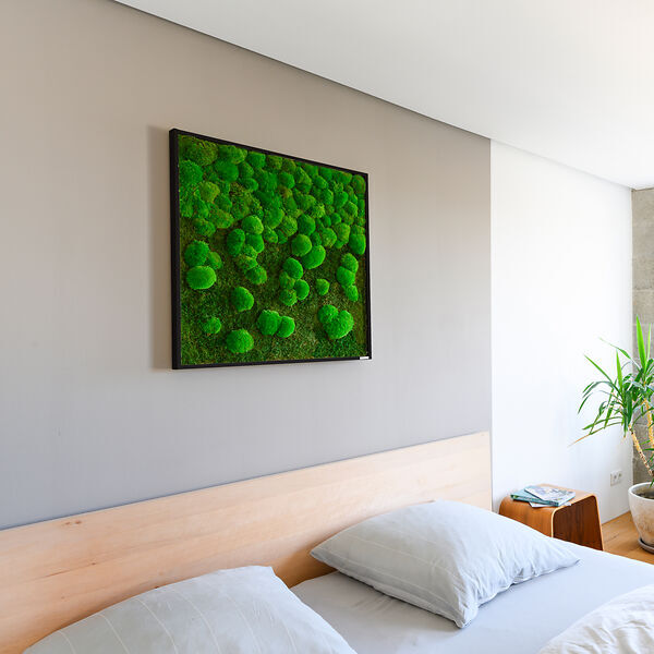 Über die 80 cm geht das sanfte Kugelmoos langsam in dunkles Waldmoos über und bietet so eine außergewöhnliche Komposition. Gut lässt sich dieses grüne Kunstwerk mit unseren Wald- und Kugelmoosbildern kombinieren.