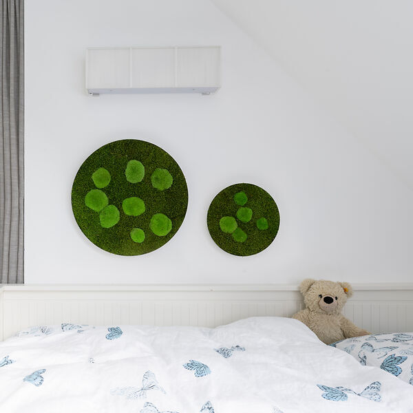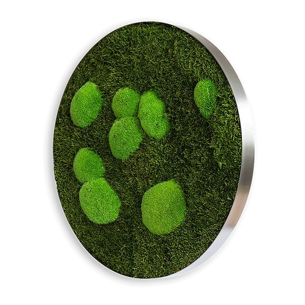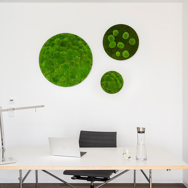 Die abwechslungsreiche Platzierung von Wald- und Kugelmoos ist ihrem Vorkommen in der Natur nachempfunden. Die so entstehenden Objekte sind daher Unikate, die in Ihren Räumen für eine angenehme Atmosphäre sorgen. Nutzen Sie diese Kreise aus natürlichen, aber pflegefreien Moos auch für Ihre Praxis oder Büroräume. Dieser Kreis aus zwei verschiedenen Moosarten eignet sich besonders gut als Ergänzung zu unseren anderen Objekten.