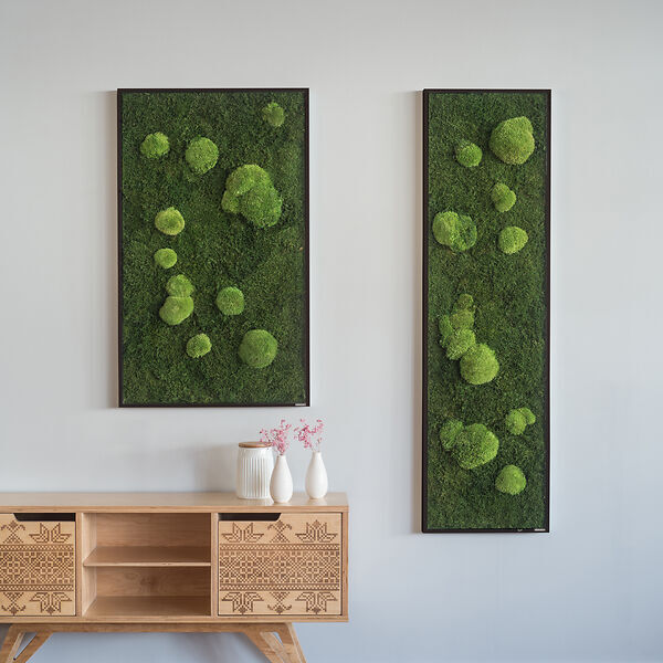 Nutzen Sie dieses 140 x 40 cm Moosobjekt wie ein Gemälde und heben Sie besondere architektonische Merkmale Ihrer Räume hervor. Hängen Sie das längliche Moosbild quer über einen Esstisch, eine Couch oder hochkant zwischen zwei Fenster. Dieses Moosbild eignet sich besonders gut als Ergänzung zu unseren anderen Objekten.