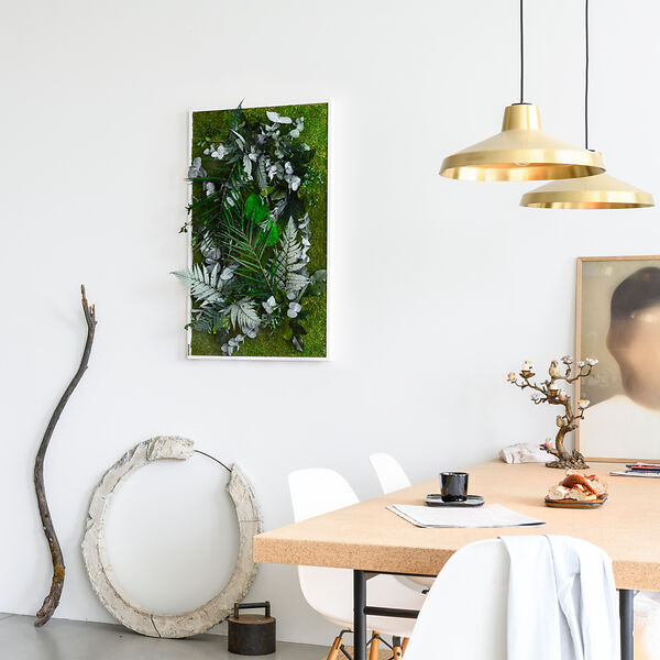 Mit einer Größe von 100 x 60 cm ist unser Pflanzenbild aus Farn, Eukalyptus und vielen weiteren aufeinander abgestimmten Pflanzen ein Sinnbild für die Lebendigkeit des Dschungels - holen Sie sich Ihn direkt nach Hause!