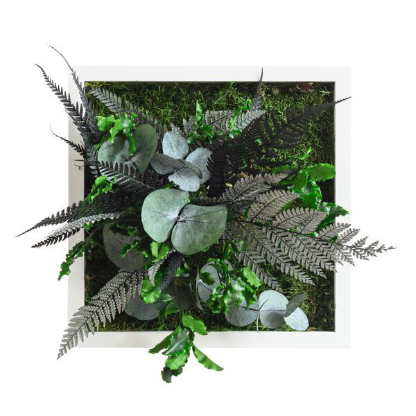 Die verwendeten Pflanzen und Moose sind zu 100% natürlich und werden in einem speziellen Verfahren dauerhaft konserviert. Sie benötigen nun weder Licht noch Wasser. Dennoch sehen die Pflanzen lebendig grün aus und fühlen sich geschmeidig und frisch an.