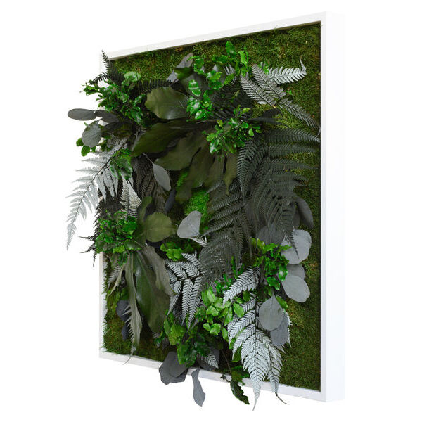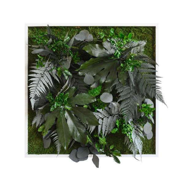 Das Pflanzenbild im Dschungeldesign befindet sich in einem weißen Vollholzrahmen. Alle verwendeten Pflanzen und Moose sind echt und zu 100 % natürlich konserviert. Aus diesem Grund sind sie ausschließlich für die Verwendung in Innenräumen gedacht.