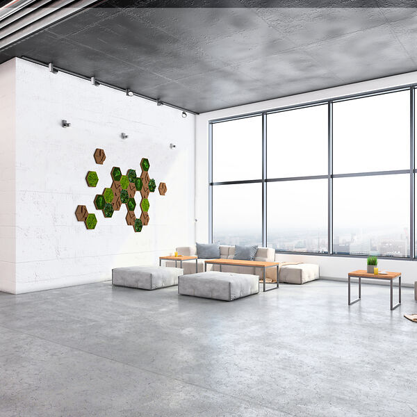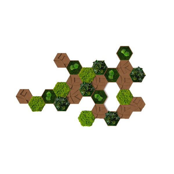 Die Hexagone bestehen zu 100% aus natürlichem Kork. Die Begrünung besteht aus 100% echten, natürlich konservierten Moosen- & Pflanzen.