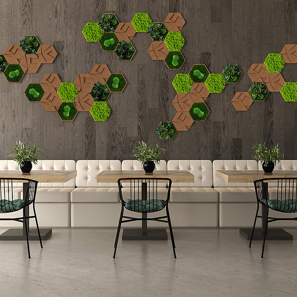Von der Natur inspiriert - für Sie realisiert! Das Kork-Hexagon 50er Set bestehend aus einer Kombination aus natürlichen Kork-, Moos- und Pflanzenelementen ist nicht nur ein stylischer Blickfang in Ihrem Büro oder Restaurant sondern sorgt sogar für ein besseres Raumklima. Werden Sie selbst zum Designer und kombinieren Sie die natürlichen Schallabsorber ganz nach Ihren Vorstellungen. Sie haben noch mehr Gestaltungsideen? Dann erweitern Sie Ihr Set bspw. um das 10er oder 25er Set!