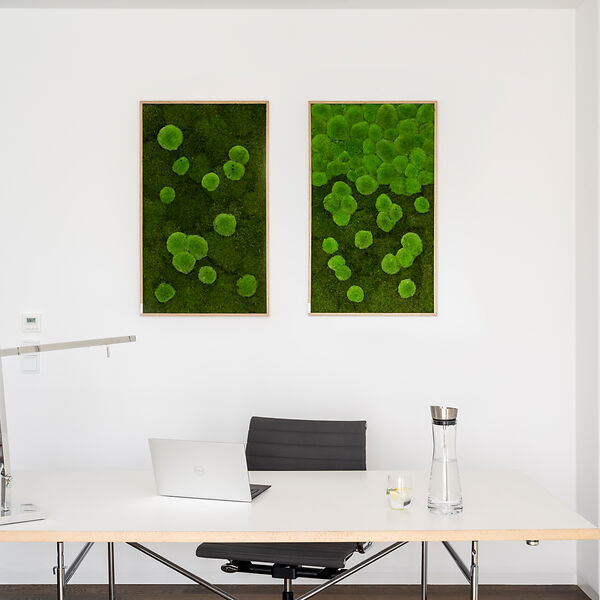 Echte Moose werden zu 100 % natürlich konserviert und anschließend in einem eleganten Vollholzrahmen in Eichenoptik arrangiert. Die Verwendung der Moosbilder ist ausschließlich für Innenräume geeignet.