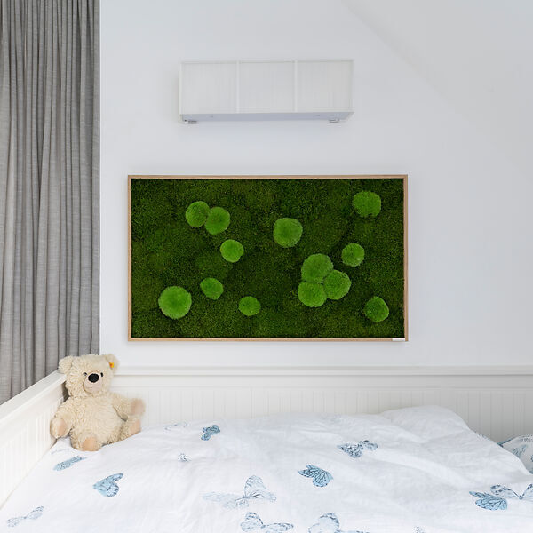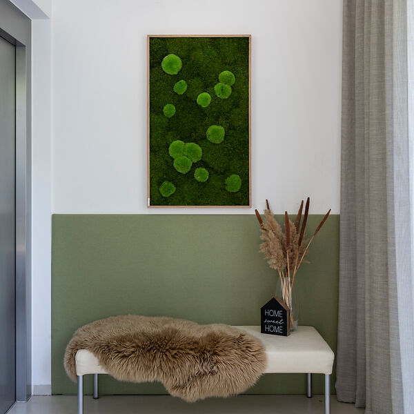 Das von der Natur inspirierte Design unseres 100 × 60 cm Wald- & Kugelmoosbildes liegt nicht nur total im Trend, wenn es um skandinavische oder rustikale Einrichtungsstile geht, sondern sorgt für pure Entspannung! Büros, Restaurants, Hotelzimmer oder das eigene Büro wirken mit dem Wald- & Kugelmoosbild frisch und natürlich. Außerdem senken unsere Bilder nachweislich den Lärmpegel, sorgen für Entspannung und reduzieren dadurch den Stress. Gerahmt in einem Vollholzrahmen in Eichenoptik entsteht ein perfekter Mix and Match aus Naturmaterialien.