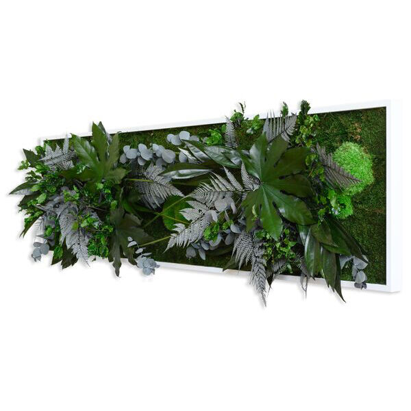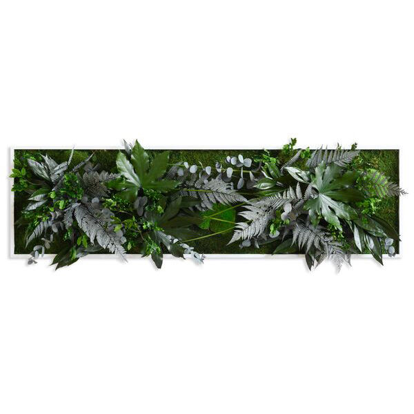 Das 140 x 40 cm Pflanzenbild im Dschungeldesign ist ein absolutes Highlight im Design-Trend der 2020er: Inspiration und Statement im Büro, Wohlgefühl und Entspannung mit Wow-Effekt für Ihr Zuhause. Tropische Akzentpflanzen werden üppig und dreidimensional in einem klaren Flow gesetzt und mit heimischen Moosen komponiert. Unser Pflanzenbild im Dschungeldesign wurde von ausgezeichneten Spitzendesignern gestaltet. Jedes einzelne ist ein handgemachtes Unikat, qualitativ hochwertig, nachhaltig und langlebig.