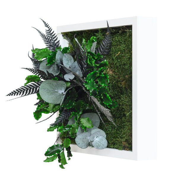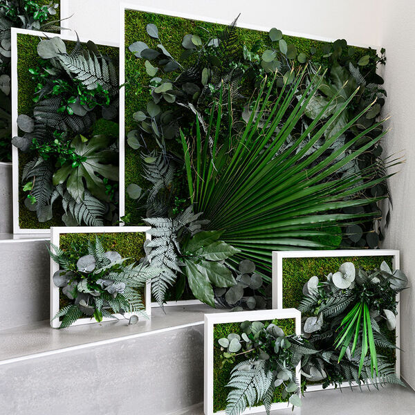 Die verwendeten Pflanzen und Moose sind zu 100% natürlich und werden in einem speziellen Verfahren dauerhaft konserviert. Sie benötigen nun weder Licht noch Wasser. Dennoch sehen die Pflanzen lebendig grün aus und fühlen sich geschmeidig und frisch an.