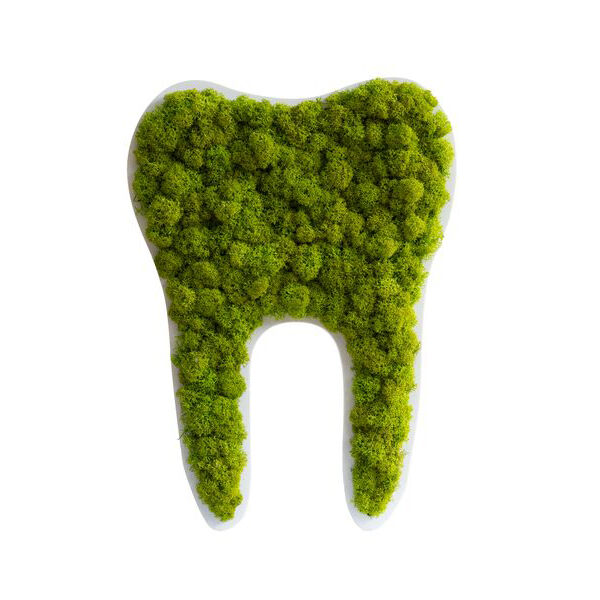 Unser Zahn besteht aus einem weiß lackierten MDF Rahmen und ist in zwei verschiedenen Begrünungsarten verfügbar. Setzen Sie einen Farbakzent aus echtem saftig-grünem Islandmoos oder sorgen Sie für einen dezenten Eyecatcher durch eine dunkle Waldmoosbegrünung.